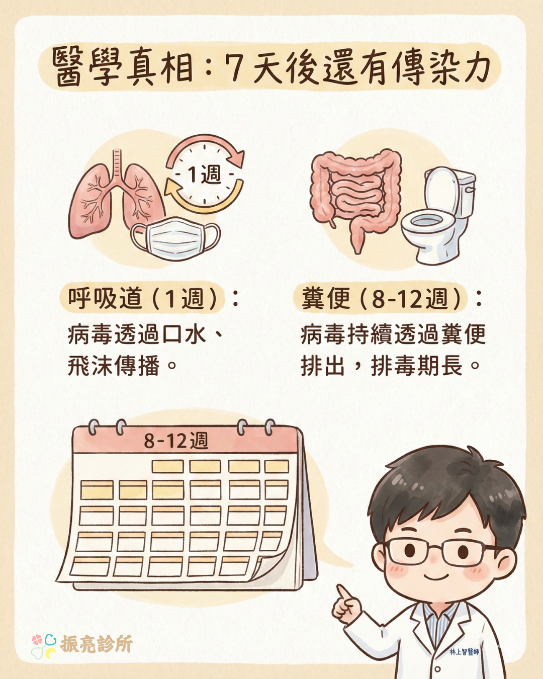 ● 病毒排出的時間: 就算症狀消失,病毒仍會透過糞便排出長達 8 到 12 週,呼吸道也會持續排出病毒 1 到 3 週。