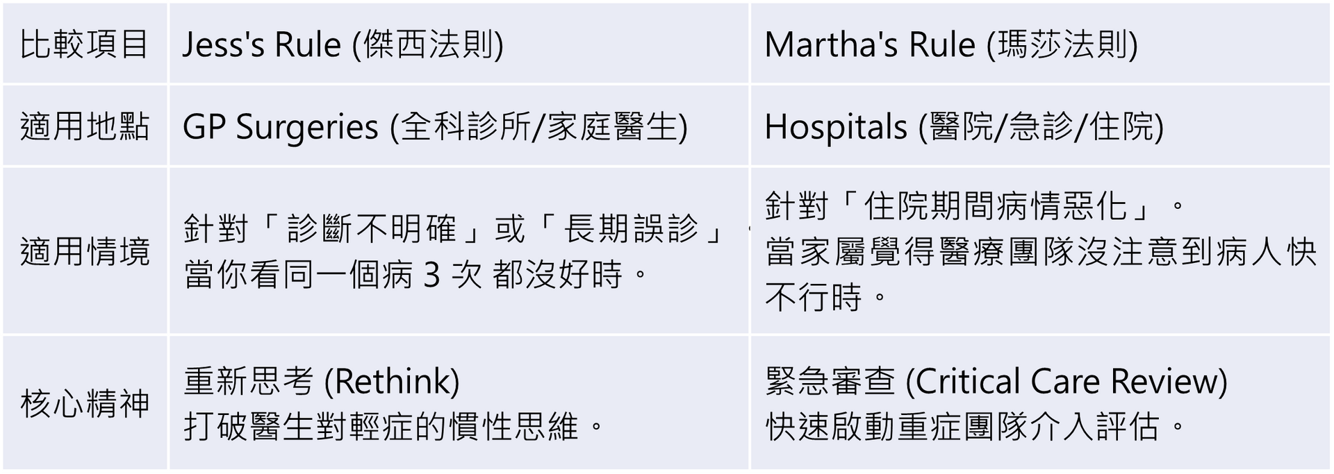 除了傑西法則,英國近年還有另一個著名的 Martha's Rule(瑪莎法則)。兩者都是為了病人安全,但適用的場景完全不同,請務必分清楚: